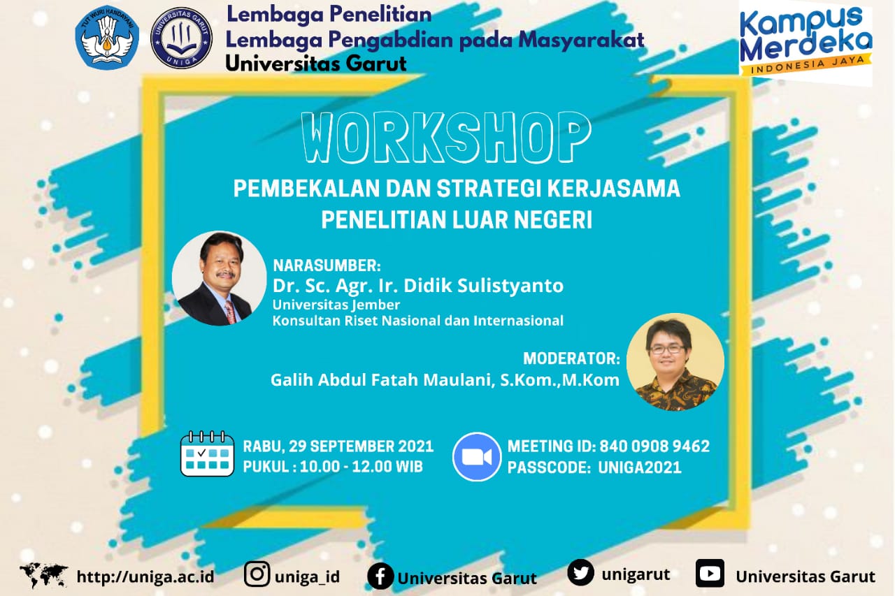 Lembaga penelitian dan Lembaga Pengabdian pada Masyarakat Universitas Garut menyelenggarakan Workshop dengan tema “Pembekalan dan Strategi Kerjasama Penelitian Luar Negeri”. Workshop dilaksanakan pada tanggal 29 September 2021 secara online via Zoom Meeting. Adapun Narasumber pada workshop ini yaitu Konsultan Riset Nasional dan Internasional, bapak Dr. Sc. Agr. Ir. Didik Sulistyanto.