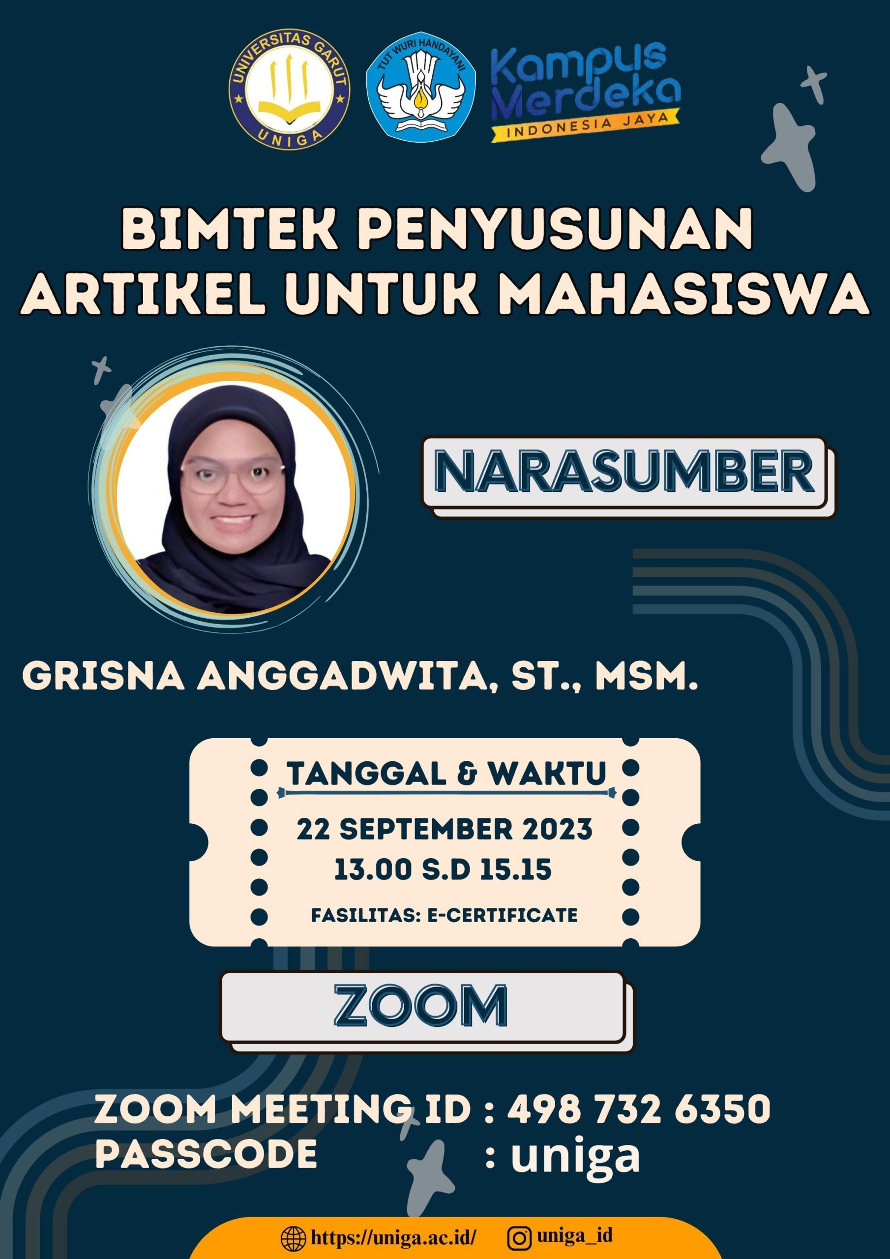 Lembaga Penelitian dan Pengabdian kepada Masyarakat Universitas Garut menyelenggarakan Workshop dengan Judul ” Bimtek Penyusunan Artikel Ilmiah untuk Mahasiswa Universita Garut″. Workshop dilaksanakan pada tanggal 22 September 2023 hari Jumat pada pukul 13.00 WIB s.d Selesai secara online melalui Zoom Meeting. Adapun Narasumber pada Workshop ini yaitu Grisna Anggadwita, ST.MSM.